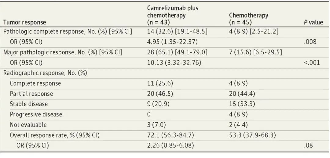 北京时间8月3日,ag尊龙凯时医药创新药卡瑞利珠单抗联合化疗(Cam+CT)对比化疗(CT)新辅助治疗ⅢA/ⅢB (T3N2) 期非小细胞肺癌(NSCLC)结果在线发表于国际权威期刊JAMA Oncology[1]。该研究是由空军军医大学唐都医院姜涛教授、雷杰教授团队联合陕西省肿瘤医院雷光焰教授团队、兰州大学第二附属医院王成教授团队共同参与的一项随机对照、多中心、Ⅱ期临床研究(TD-FOREKNOW,NCT04338620)。研究结果显示,与化疗相比,卡瑞利珠单抗联合化疗新辅助治疗NSCLC显著提高了病理完全缓解(pCR)率(32.6% vs 8.9%,OR=4.95,95% CI :1.35-22.37, P =0 .008),且安全性良好。本研究是卡瑞利珠单抗新辅助治疗可切除NSCLC患者的首个随机对照研究,为NSCLC新辅助免疫治疗再添新证。